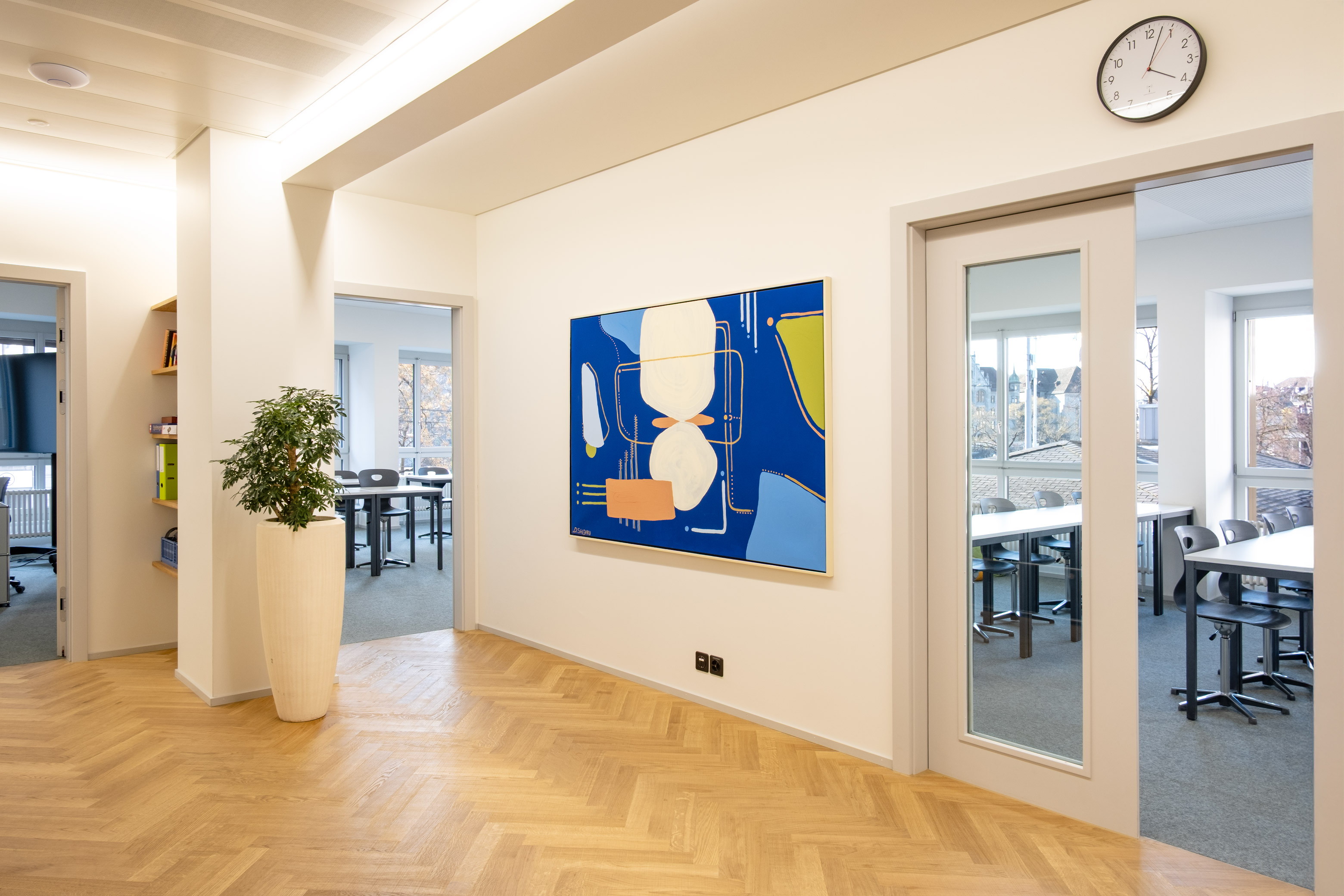 Unser 2024 eröffneter Standort überzeugt durch helle, moderne Räumlichkeiten und eine klare, strukturierte Raumgestaltung. Unsere Schule ist auf einer Ebene angelegt, was eine offene und familiäre Lernatmosphäre schafft.